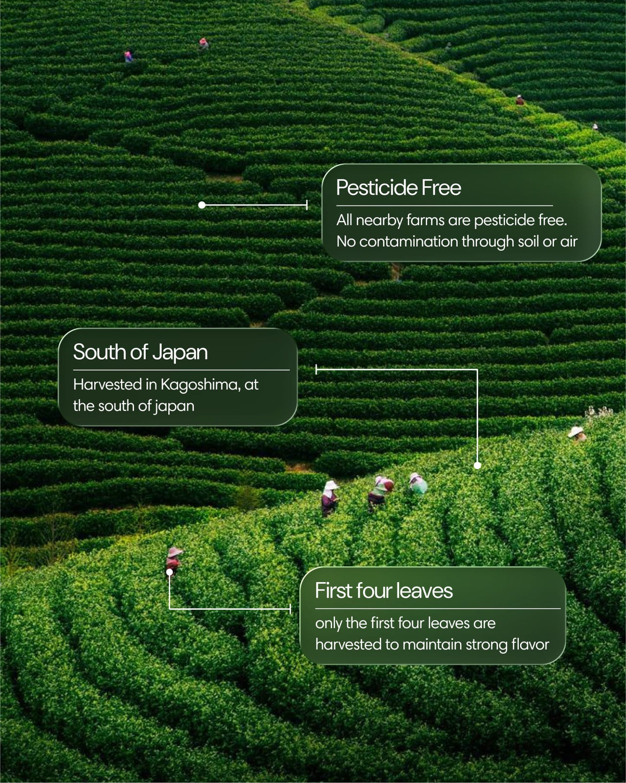 Clearly Matcha is of the highest ceremonial quality, sourced from a unique, fully organic region in Kagoshima, Japan. It's grown without pesticides or herbicides, and all neighboring farms are organic. That means you can be sure the soil is completely clean.